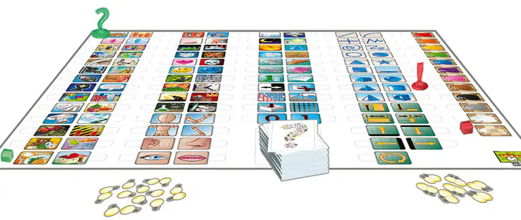 Een speler kiest een woord of begrip en gebruikt pionnen op het iconenbord om kenmerken aan te geven. Denk aan categorieën zoals “dier”, “kleur”, “actie” of “grootte”. Zo kun je bijvoorbeeld het icoon ‘dier’ combineren met ‘geel’, ‘zwart’ en ‘vliegen’ om duidelijk te maken dat het om een bij gaat.