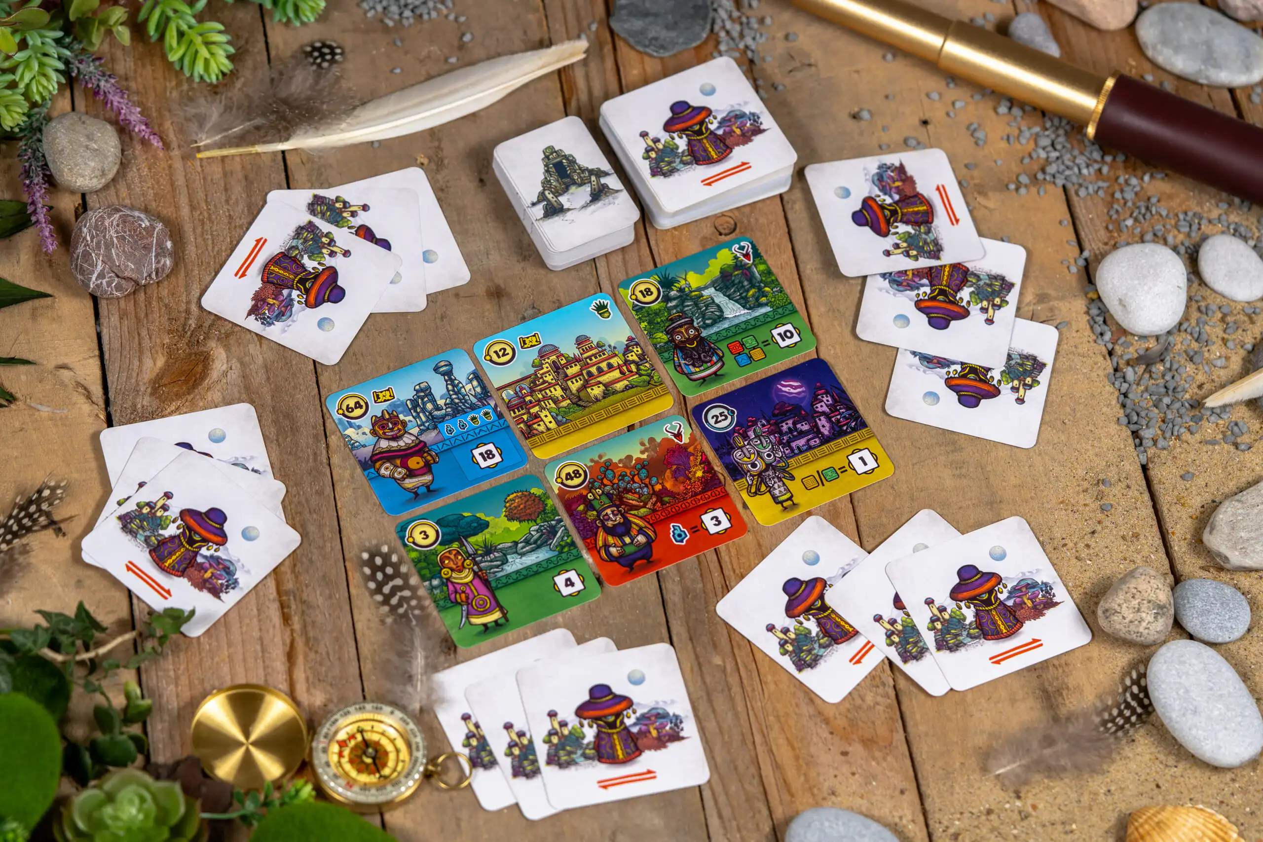 Het spel duurt 8 rondes. Elke ronde kies je één regiokaart en voeg je deze toe aan je rij. Sommige kaarten leveren direct punten op, andere activeren bonussen, hulpmiddelen of heiligdommen die pas later hun waarde tonen. Tijdens de puntentelling worden steeds meer kaarten actief, waardoor een slimme kettingreactie enorme scores kan opleveren.
