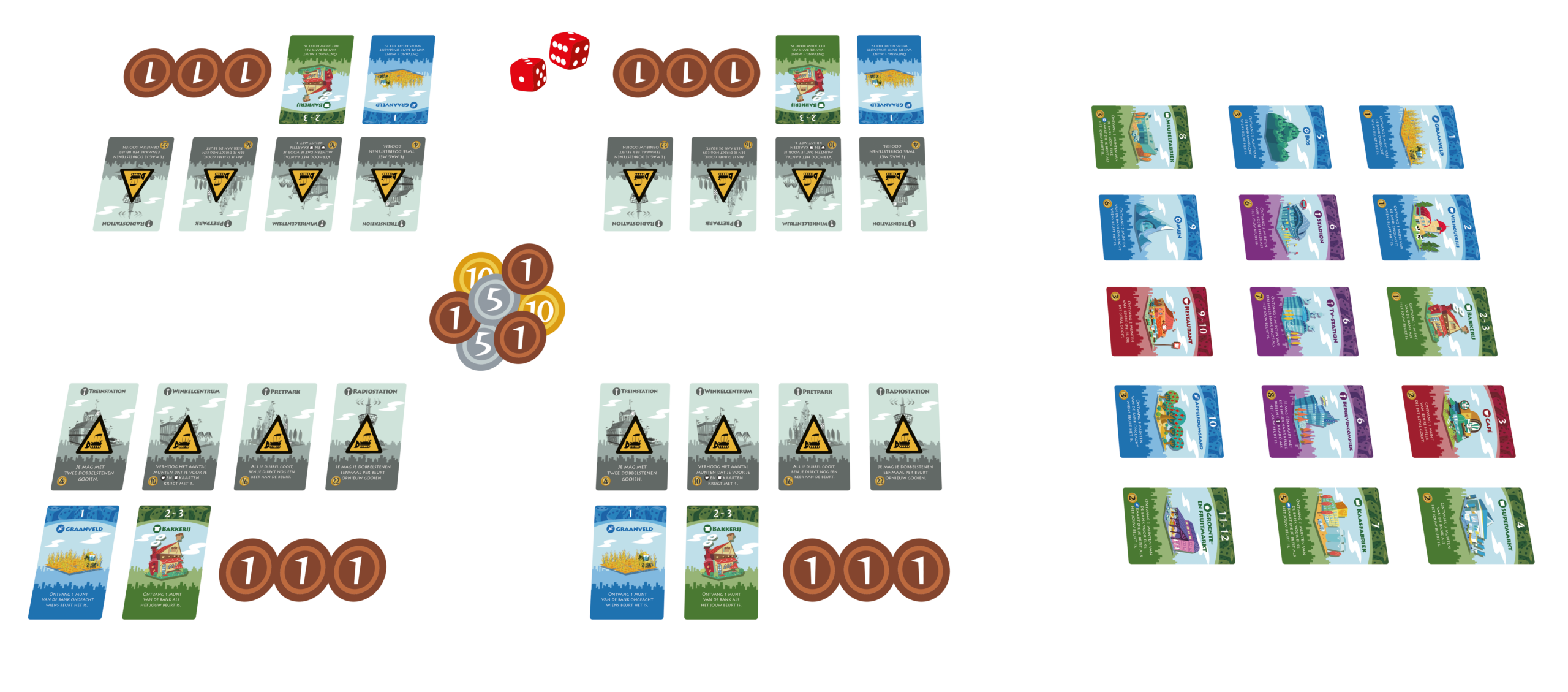In Machi Koro gooi je dobbelstenen om inkomsten te genereren uit je gebouwen. Sommige gebouwen leveren geld op in jouw beurt, andere juist in de beurt van tegenstanders – en weer andere laten je geld afpakken van je medespelers. Het draait om timing, keuzes maken en het slim combineren van gebouwen.