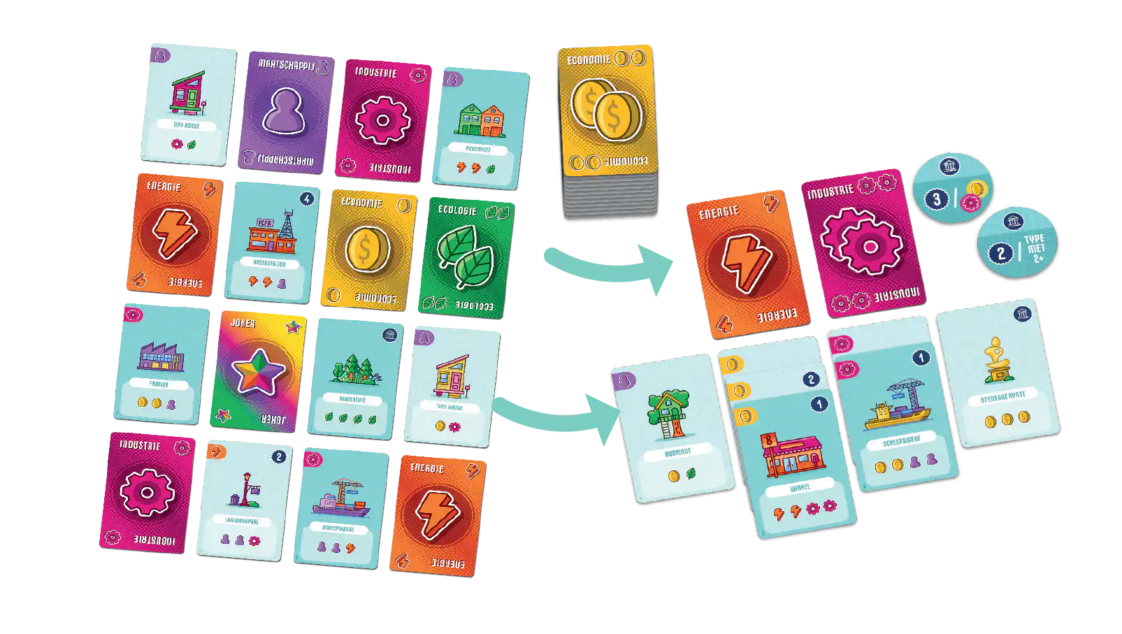 Het spel draait om eenvoudige keuzes met grote gevolgen. In je beurt neem je twee aangrenzende kaarten uit het centrale stadsraster en voeg je deze toe aan je stad. Grondstofkaarten leveren de materialen die je nodig hebt om gebouwen te bouwen, terwijl gebouwen punten scoren op basis van specifieke combinaties en voorwaarden.