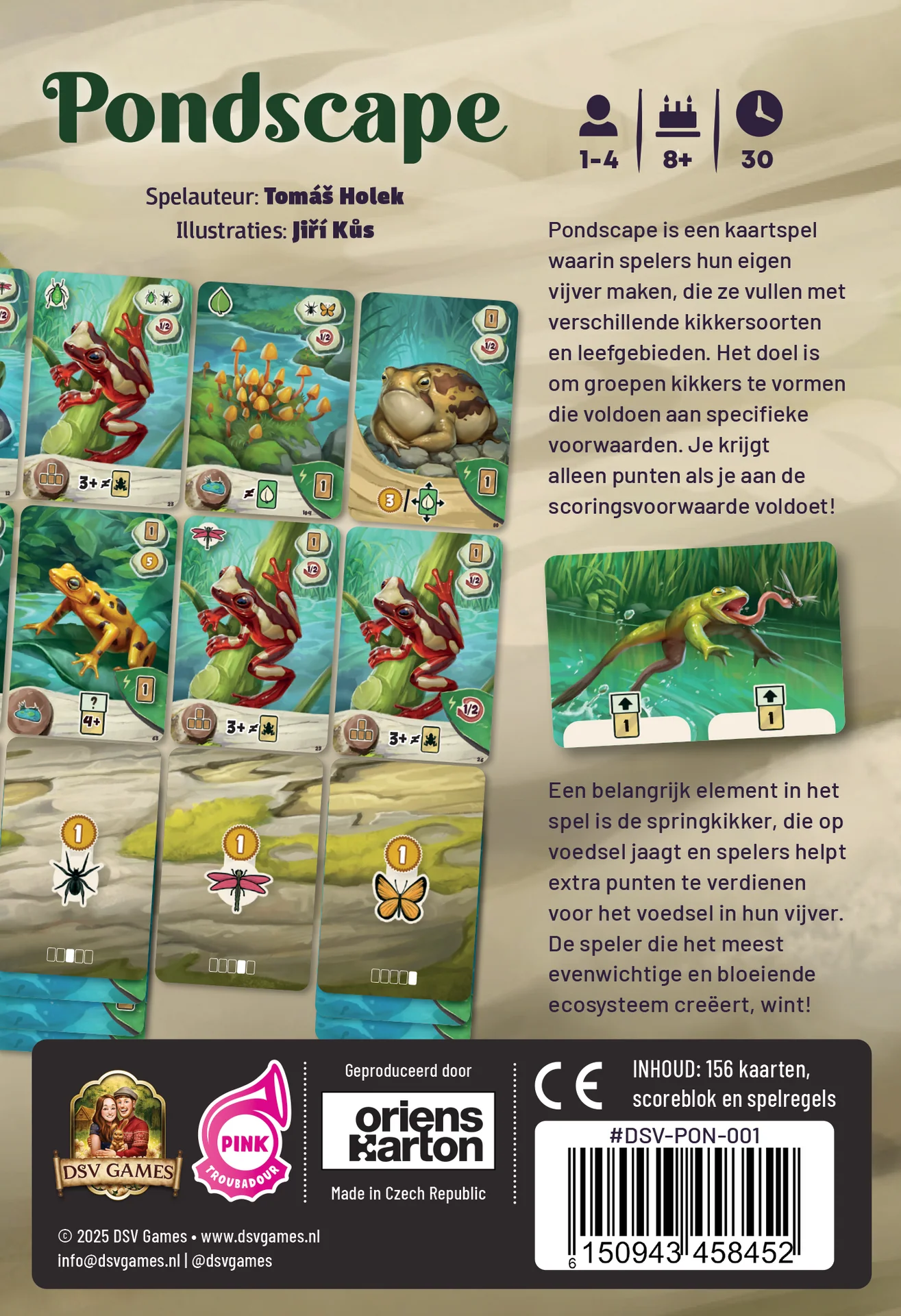 Pondscape Kaartspel NL is een strategisch kaartspel voor 1 tot 4 spelers waarin je je eigen vijver bouwt met kikkers en landschappen. Verzamel insecten, speel slim in op de springkikker en scoor punten met de beste combinaties.