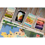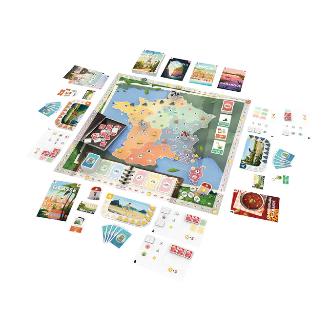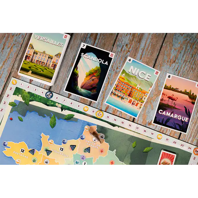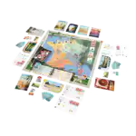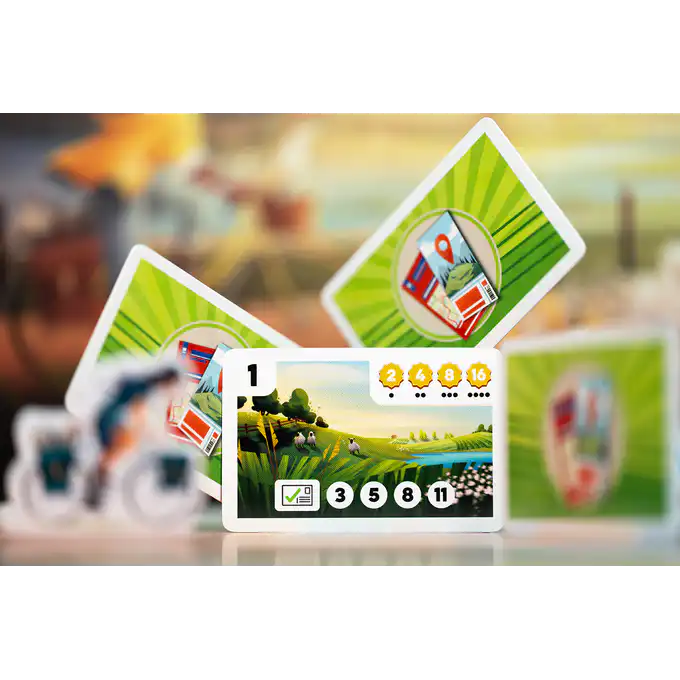 Postcards is een vrolijk bordspel waarin je per fiets door verschillende regio’s reist om ansichtkaarten en souvenirs te verzamelen. Plan je route slim, zet je kamp op het juiste moment en scoor de meeste punten.