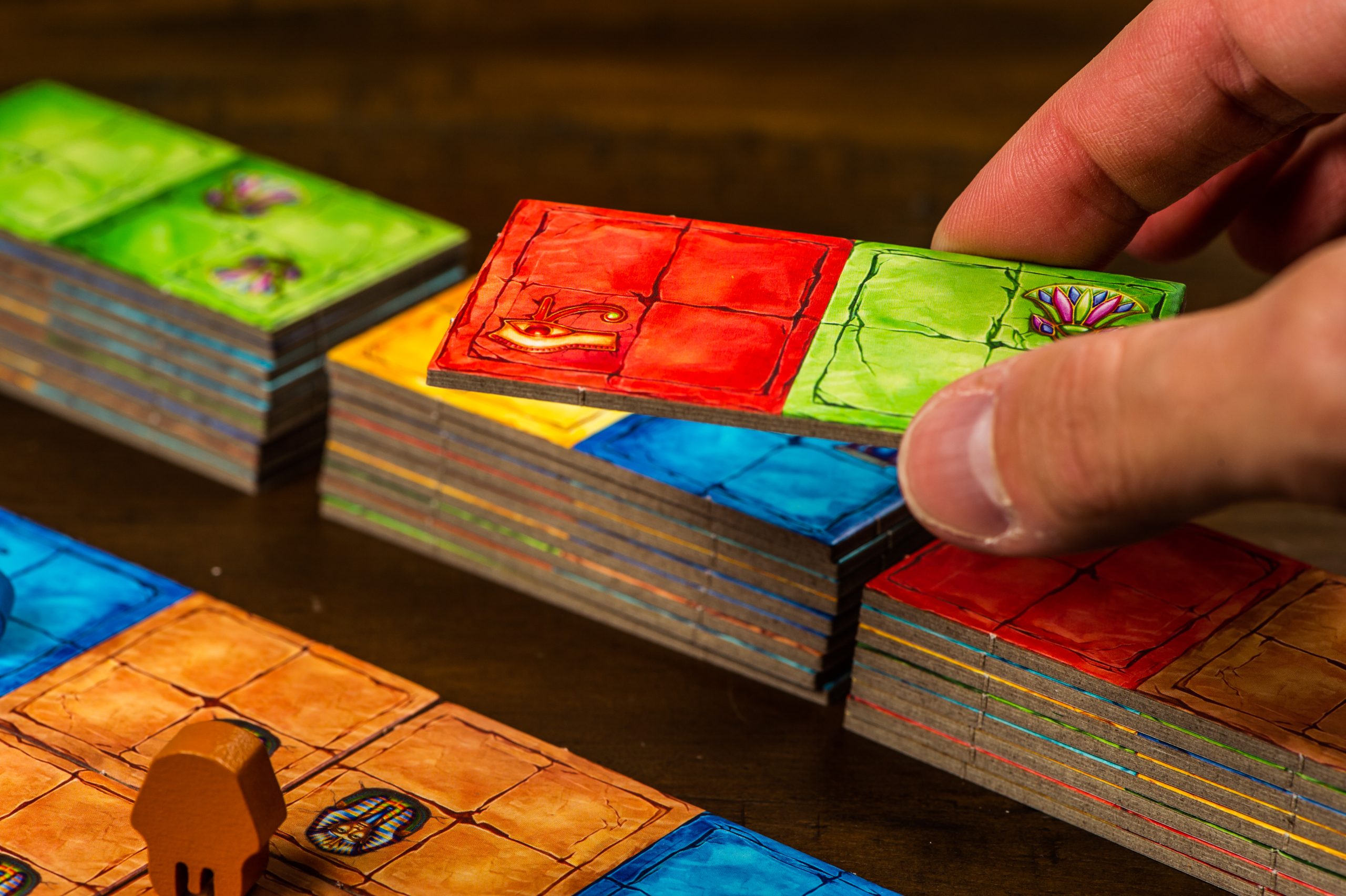Pyramido is een rustig maar strategisch familiespel waarin je in vier fases een piramide van vier lagen bouwt. Elke beurt plaats je een bouwtegel en probeer je kleuren en symbolen slim te combineren om juwelen te scoren. De lagen beïnvloeden elkaar, waardoor vooruit plannen essentieel is. Toegankelijk, tactisch en elke pot anders.