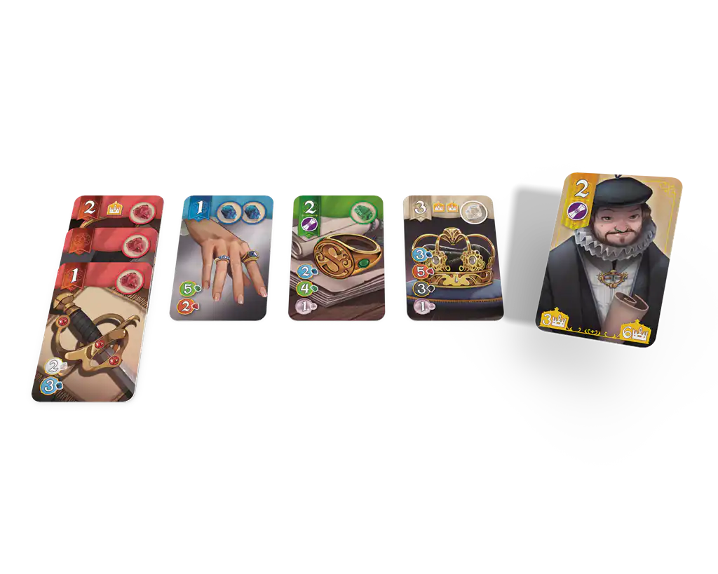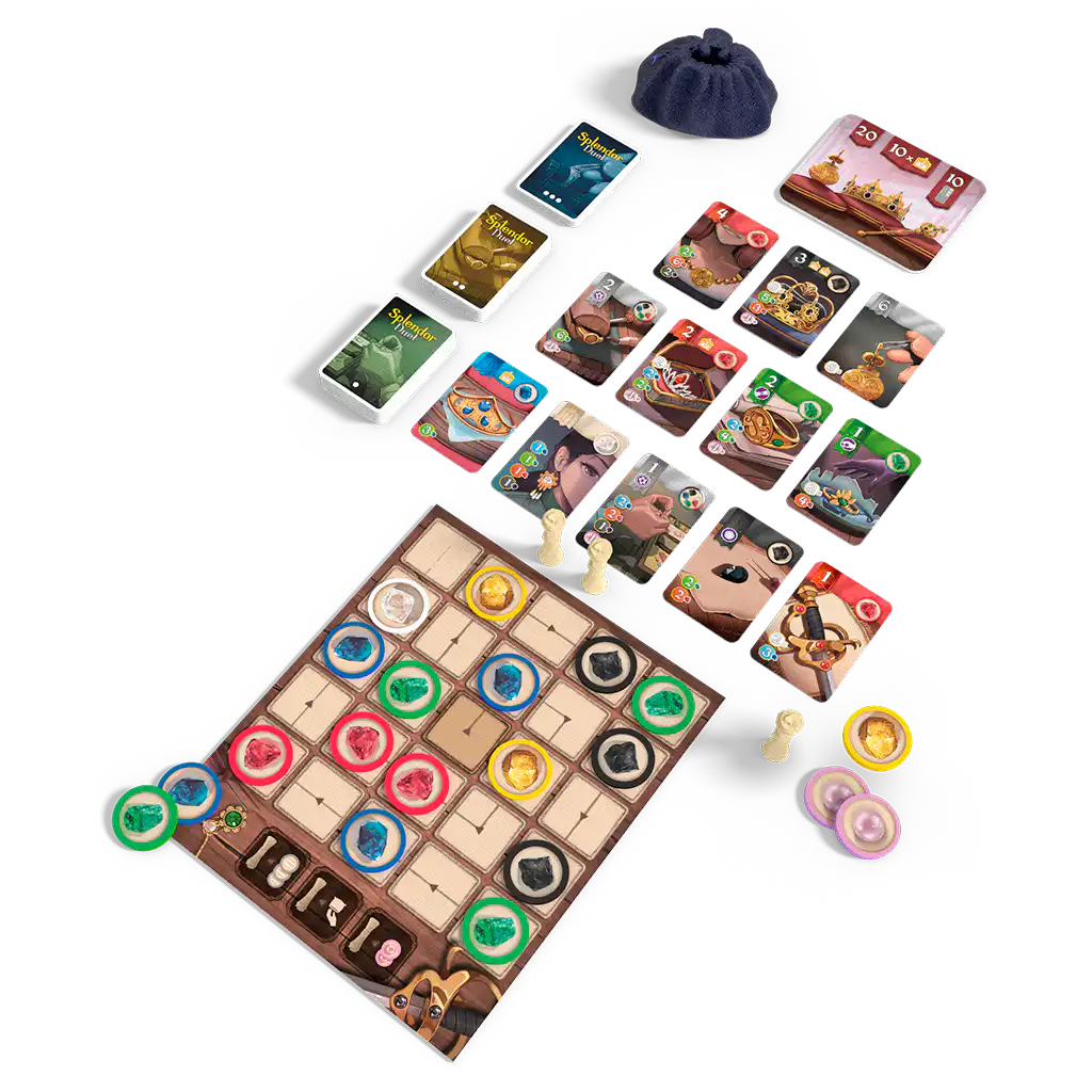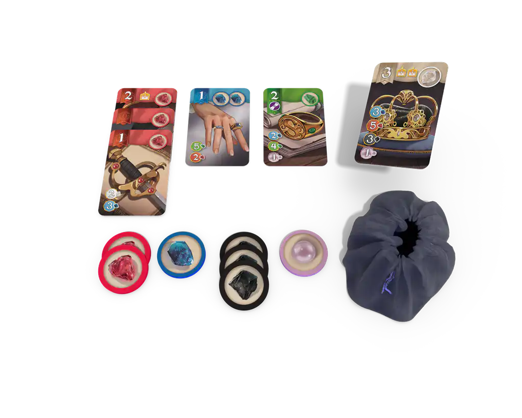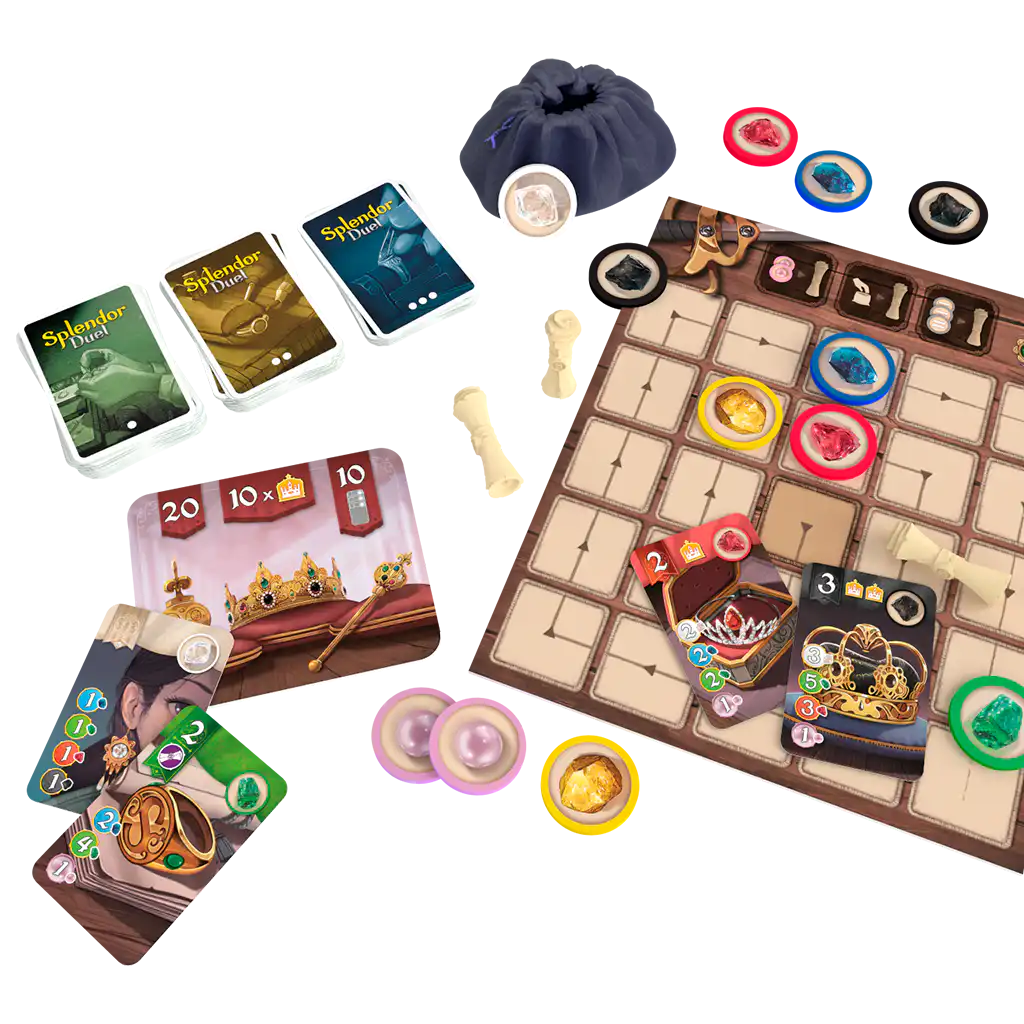 Splendor Duel is een tactisch tweespelerspel met de Splendor-kern, maar met meer directe spanning en meerdere manieren om te winnen. Je verzamelt fiches en parels, koopt kaarten en bouwt kortingen op voor volgende beurten.