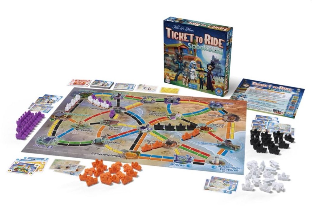 Ticket to Ride Spookstad is routebouwen in een kindvriendelijke, spookachtige setting. Het thema zit in het verbinden van locaties en het afvinken van doelen, alsof je een klein netwerk in een griezelstad opbouwt.