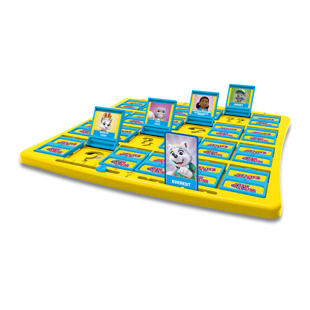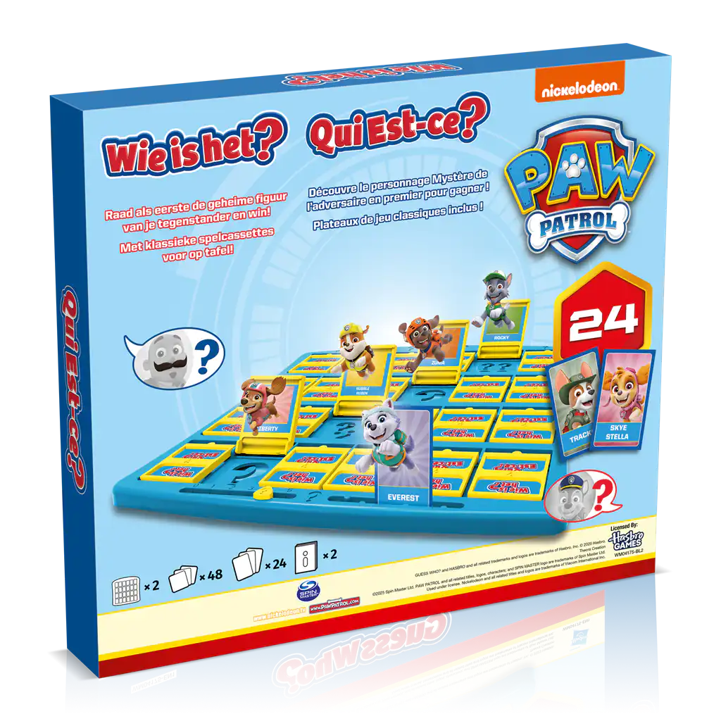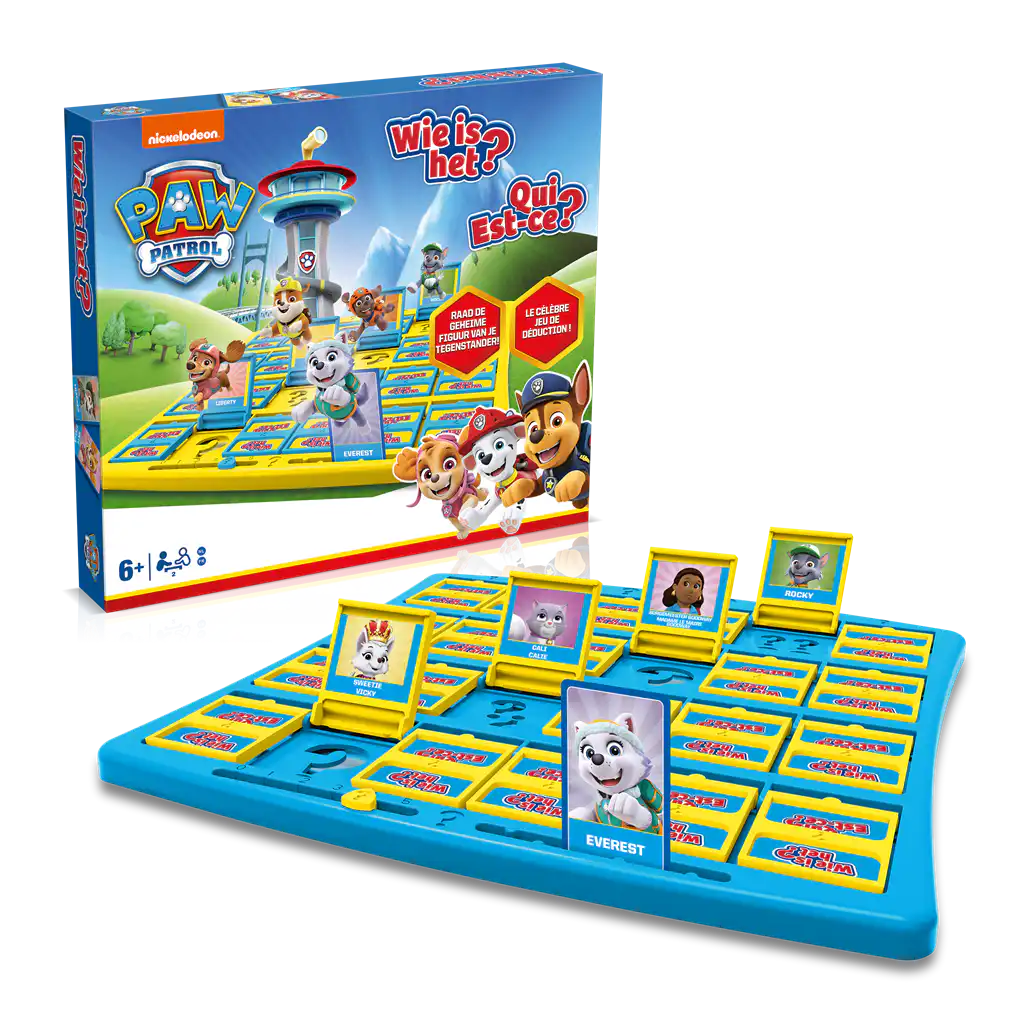 Wie is het? Paw Patrol is de Paw Patrol-editie van het klassieke raadspel waarin je via ja/nee-vragen als eerste het geheime karakter probeert te vinden. Je stelt om de beurt vragen over kenmerken en klapt onmogelijke opties weg op je bord.